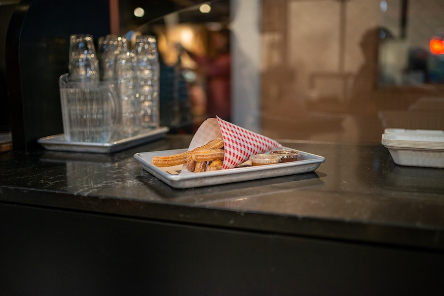 Régalez-vous de churros fraîchement préparés accompagnés d’une sauce au chocolat noir maison et du nougat artisanal à saveur de pistache.